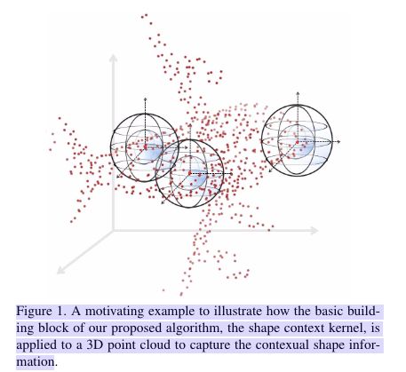 摘要我们在网络设计中采用形状上下文的概念作为构建块,开发了一种新的表示方法。由此产生的模型称为ShapeContextNet,它由一个层次结构组成,其中的模块不依赖于固定的网格,同时仍具有类似于卷积神经网络的特性——能够捕获和传播对象部分信息。此外,从基于自我注意的模型中得到启发,将自注意力应用到点云。Shape Context Net是一种端到端模型,可应用于一般的点云分类和分割问题。图1:三维中的形状上下文内核来捕捉空间信息引言我们的论文将重点放在开发一种用于点云分类的深度学