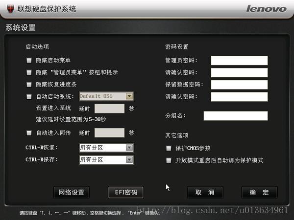 系统设置界面如图3-2所示,可以对您的计算机进行引导启动选项的设置,以及管理员密码和保留数据密码的设定和修改等。