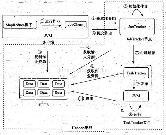 图3给出了MapReduce作业详细的执行流程图,有运行作业、获取作业ID、复制作业资源、提交作业、初始化作业、获取输入分割、心跳通信、获取作业资源、发布、运行、输出这11个步骤。其中涉及到4个主要的实体:客户端(Client)、JobTracker、TaskTracker、HDFS。客户端负责编写MapReduce代码,配置作业,提交作业;JobTracker负责初始化作业,分配作业,与TaskTracker通信,协调整个作业的执行;TaskTracker保持与JobTracker的通信,在分配的数据片段上执行Map或Reduce任务,需要主要注意的是图3中TaskTracker节点后的省略号表示Hadoop集群中可以包含多个TaskTracker;HDFS保存作业的数据、配置信息等,保存作业结果。
