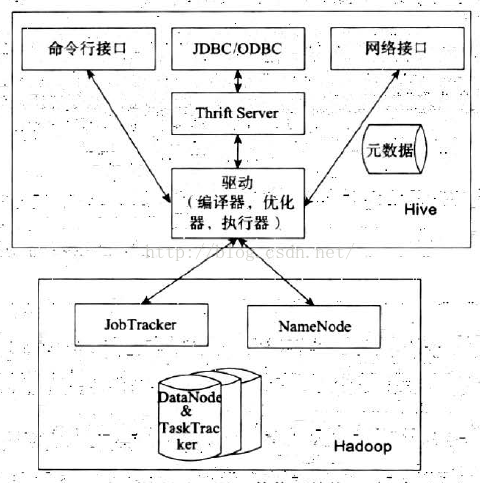 Hive数据仓库包含四类数据模型:表(Table)、外部表(External Table)、分区(Partition)、桶(Bucket)。表:和数据库表在概念上类似,在Hive中对应着一个存储目录;分区:每个分区都对应数据库中相应分区列的一个索引,hive中每个分区对应表下的一个目录,所有分区的数据都存储在对应的目录中;桶:在对指定列进行哈希计算时,会根据哈希值切分数据,使每个桶对应一个文件;外部表:指向在HDFS中存在的数据,可以创建分区,和表在元数据组织上是相同,但数据存储存在较大差异,差异体现有两点,1)表创建过程和数据加载步奏,数据加载时,实际数据会移动到数据仓库目录中,之后访问直接访问数据仓库目录,删除表时,表中的数据和元数据同时删除。2)外部表的创建只有一个步奏,创建表和加载数据同时完成,实际数据存储在创建语句Location指定的HDFS路径中,不会移动到数据仓库中,删除表时,只删除元数据,不删除表数据。图5展示了Hive的体系结构。