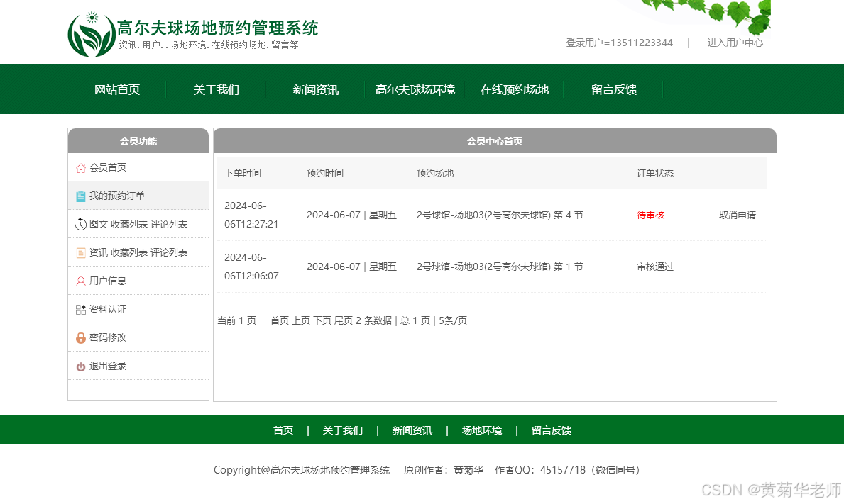 我的预约订单:显示已经预约的场地订单信息,包含场地信息、预约日期,审核状态等。