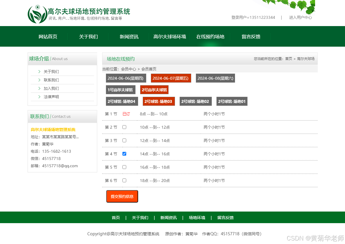 场地预约:选择日期、选择场地、选择日期,提交预约。