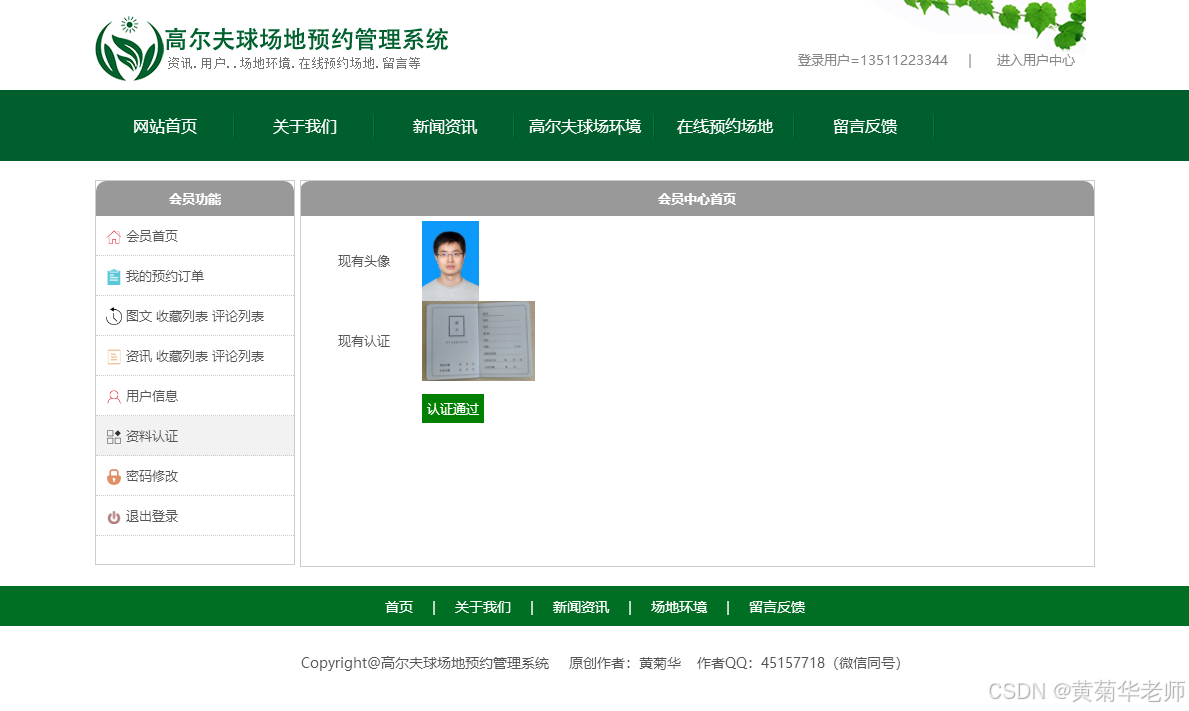 会员审核:查看用户认证资料,审核后可以预约场地。