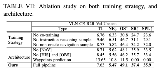 为了验证我们方法中各组件的有效性,我们在训练策略和网络结构两个方面进行了消融实验,结果列于表 VII。实验表明,联合微调数据(co-tuning data)对性能至关重要,缺乏这些数据将导致大模型丧失泛化能力。如预期所示,加入指令推理样本和 Dagger 的导航动作样本均提升了性能,这启发我们:进一步采集更多导航相关数据可能有望进一步提升模型表现,这也是未来 VLM 在 VLN 领域的一个重要方向。