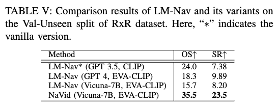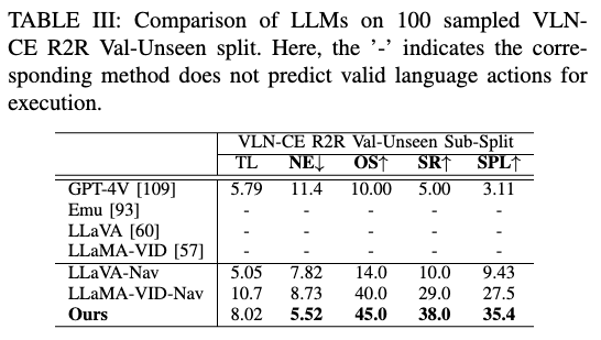 我们评估主流大模型(GPT-4V、Emu、LLaVA、LLaMA-VID)在 VLN 中的表现。原始模型在无导航数据训练情况下几乎无法执行动作,仅 GPT-4V 能勉强输出有效动作(5% SR)。经过导航数据微调的 LLaVA-Nav 与 LLaMA-VID-Nav 表现显著提升,LLaMA-VID-Nav 的有效动作输出率从 0 % → 91.3 % 0\% \rightarrow 91.3\% 0%→91.3%。