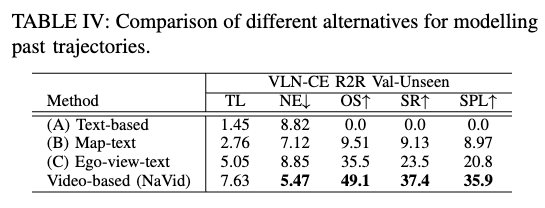 NaVid 中历史观测帧的 token 数量可以与当前帧不同,从而使历史轨迹编码更具适应性和表达力,相比于之前方法中的文本描述或离散图结构,更符合视频建模的要求。