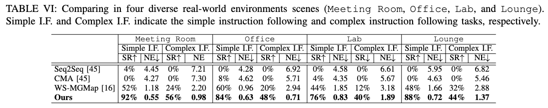 为评估真实场景中的表现,我们复现 [8, 108] 的实验设置,涵盖多种室内场景与指令难度。选取 4 个典型场景(会议室、办公室、实验室、休息区),每个场景设计 25 条简单地标类指令与 25 条复杂组合指令,共 200 个测试用例。