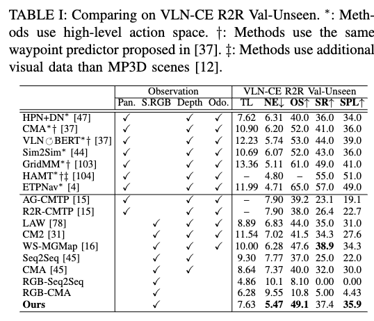 我们在 VLN-CE 基准测试上评估所提方法,该测试提供了基于重建真实场景的连续模拟环境 [45],用于执行低层级动作。所用数据集包括两个广泛认可的基准:R2R [46] 和 RxR [49]。所有方法均在 R2R 的 10,819 条训练轨迹上训练,在 R2R val-unseen(1,839 条)与 RxR val-unseen(1,517 条)上测试,以评估跨分割与跨数据集的泛化能力。