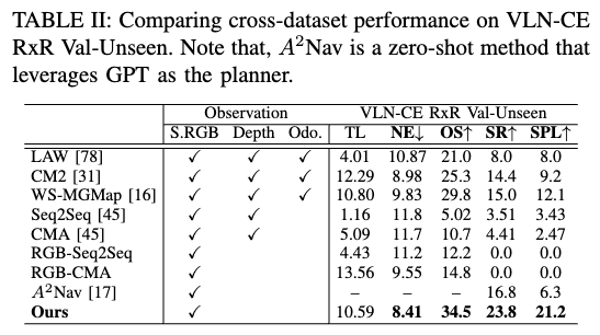- 在 **跨数据集评估(R2R → RxR)**上也有显著提升;