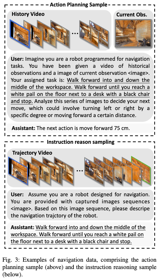 此外,我们的基于视频的方法能够有效地将机器人的历史观察编码为时空上下文信息,以支持决策制定与指令理解。在训练过程中,我们使用了来自连续环境中共计 51 万个导航样本,包括动作规划与指令推理数据,同时结合了 76.3 万规模的大型网页数据。