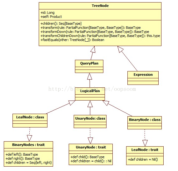 在Catalyst里,这些Node都是继承自Logical Plan,可以说每一个TreeNode节点就是一个Logical Plan(包含Expression)(直接继承自TreeNode)