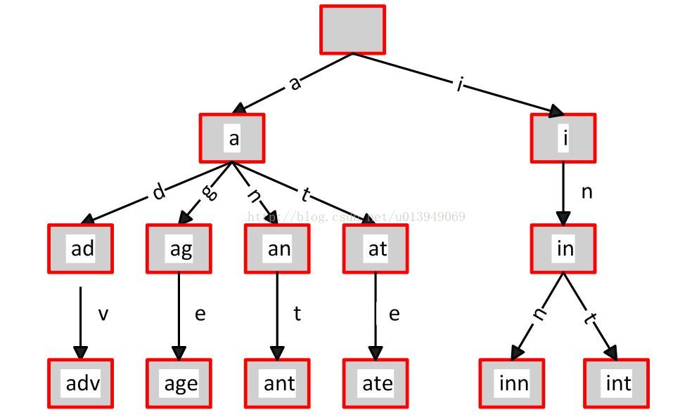 单词inn与单词int有共同的前缀“in”, 因此他们共享左边的一条分支,root->i->in。同理,ate, age, adv, 和ant共享前缀"a",所以他们共享从根节点到节点"a"的边。