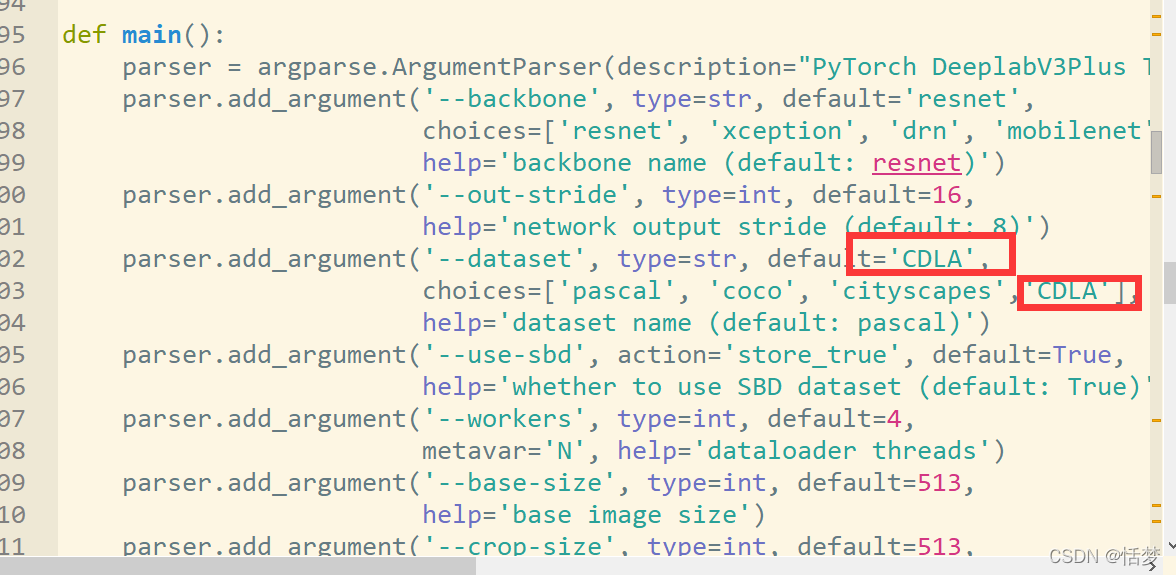 python train.py --backbone resnet --lr 0.007 --workers 1 --epochs 50 --batch-size 8 --gpu-ids 0 --checkname deeplab-resnet --dataset CDLA