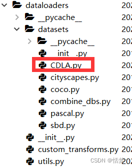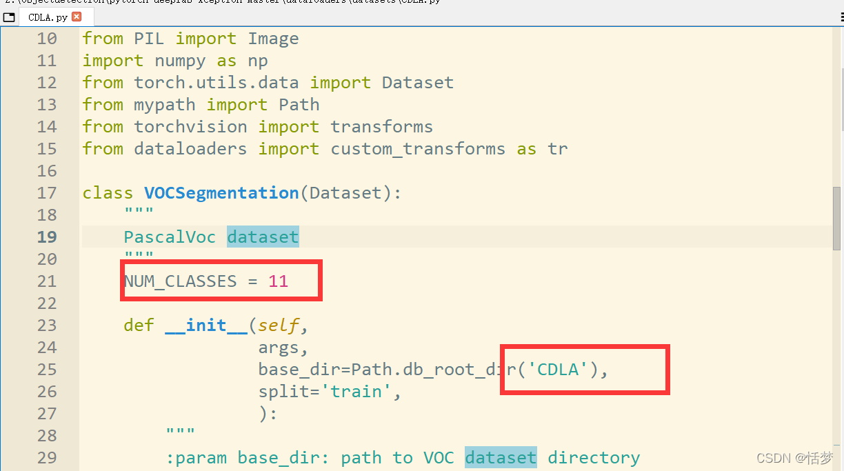 (2)在dataloaders/datasets路径下创建自己的数据集文件,这里创建CDLA.py,因为我使用的是voc格式,所以直接将pascal.py内容复制过来修改为自己的数据集以及类别数,此处我处理的数据为11类。