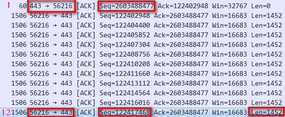 对于443 <--> 56216 的数据交互,从443-->56216的1号报文,其Ack为122402948,而12号报文56216 -->443的报文的Seq为122417468,其Len为1452,那么在途字节数为122417468 + 1452 - 122402948= 15972(为方便讲解,特意取了12号报文,其他报文也可)。其中122417468 + 1452表示已发送数据(Seq + Len),122402948表示Ack。