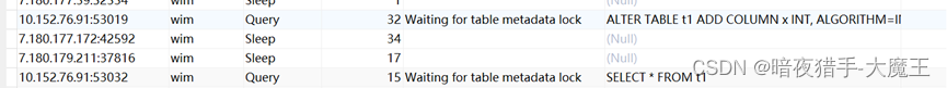 可以使用 SHOW FULL PROCESSLIST来确定事务是否正在等待元数据锁定。
