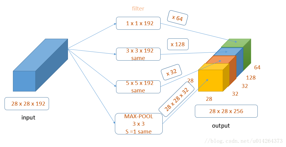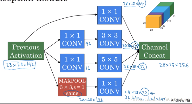 这里池化层最后要加做一个1 x 1的卷积,保持维度一致。这就是最终版本的Inception模块。