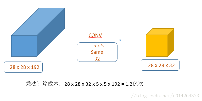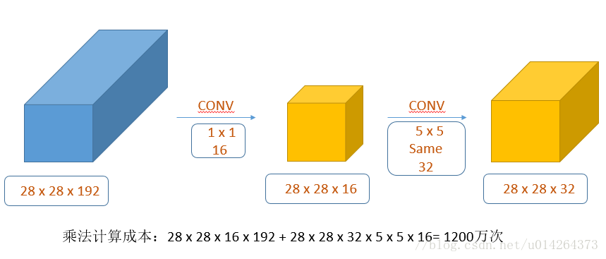 上述的计算成本是1.2亿次,计算方法为:我们最后得到的是28 x 28 x 32个数字,试想一下卷积的过程,每一个数字的来源都要经过5 x 5 x192次计算,最后把两个相乘起来就好了。