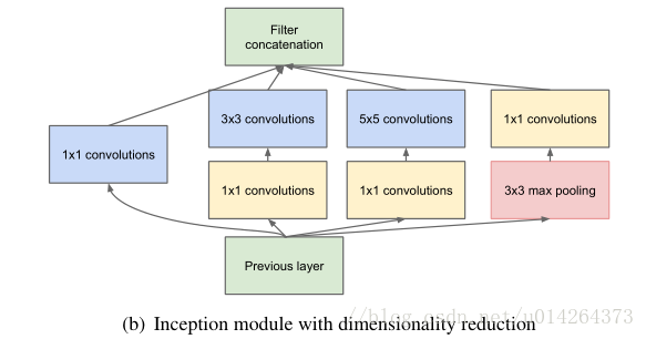 上述模块的一个大问题是在具有大量滤波器的卷积层之上,即使适量的5×5卷积也可能是非常昂贵的,至少在这种朴素形式中有这个问题。一旦池化单元添加到混合中,这个问题甚至会变得更明显:输出滤波器的数量等于前一阶段滤波器的数量。池化层输出和卷积层输出的合并会导致这一阶段到下一阶段输出数量不可避免的增加。虽然这种架构可能会覆盖最优稀疏结构,但它会非常低效,导致在几个阶段内计算量爆炸。(这个问题不是很明白)