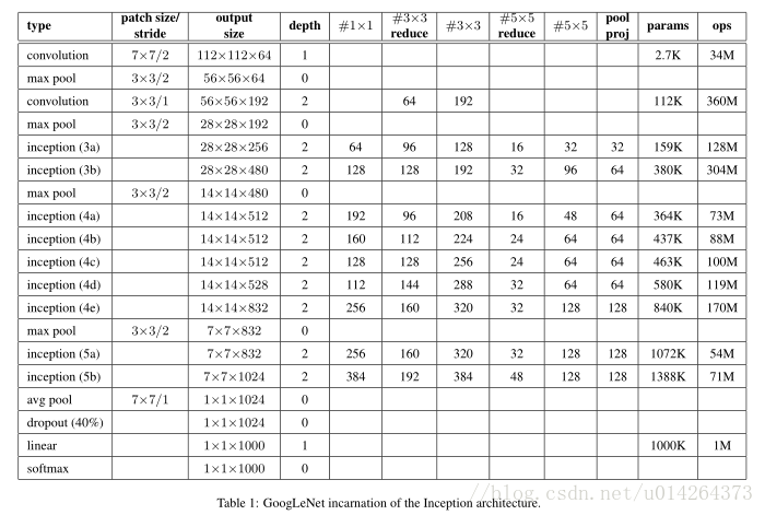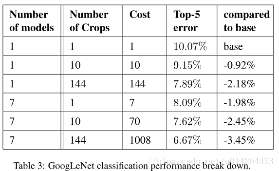 通过“GoogLeNet”这个名字,我们提到了在ILSVRC 2014竞赛的提交中使用的Inception架构的特例。我们也使用了一个稍微优质的更深更宽的Inception网络,但将其加入到组合中似乎只稍微提高了结果。我们忽略了该网络的细节,因为经验证据表明确切架构的参数影响相对较小。表1说明了竞赛中使用的最常见的Inception实例。这个网络(用不同的图像块采样方法训练的)使用了我们组合中7个模型中的6个。