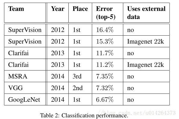 的错误率,在其它的参与者中排名第一。与2012年的SuperVision方法相比相对减少了56.5%,与前一年的最佳方法(Clarifai)相比相对减少了约40%,这两种方法都使用了外部数据训练分类器。表2显示了过去三年中一些表现最好的方法的统计。