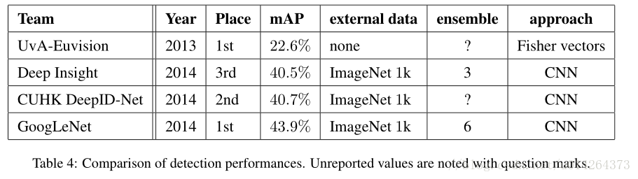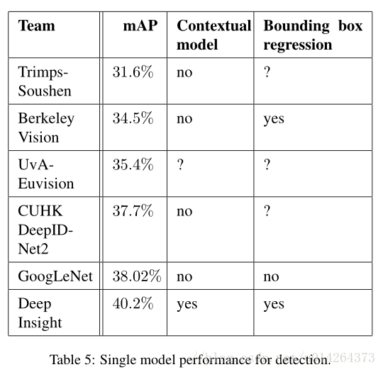 我们首先报告了最好检测结果,并显示了从第一版检测任务以来的进展。与2013年的结果相比,准确率几乎翻了一倍。所有表现最好的团队都使用了卷积网络。我们在表4中报告了官方的分数和每个队伍的常见策略:使用外部数据、集成模型或上下文模型。外部数据通常是ILSVRC12的分类数据,用来预训练模型,后面在检测数据集上进行改善。一些团队也提到使用定位数据。由于定位任务的边界框很大一部分不在检测数据集中,所以可以用该数据预训练一般的边界框回归器,这与分类预训练的方式相同。GoogLeNet输入没有使用定位数据进行预训练。
