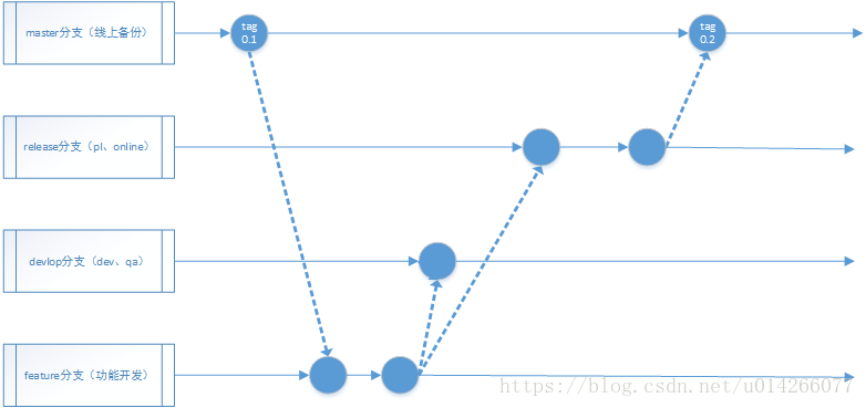 每次发布线上成功并且验收通过后,将release分支合并到master分支,然后打个标签,作为线上代码的存档,紧急情况下也可以发布master分支的代码到生产环境