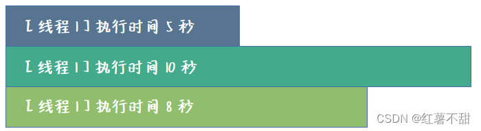 - 第 5 秒钟: 线程 1 执行完毕;线程 2 执行了一半; 线程 3 还差 3 秒执行完毕;
