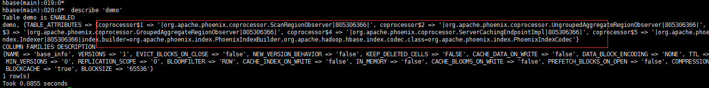 DELETE from SYSTEM.CATALOG where TABLE_NAME ='demo';的方式删除的.删除以后发现重新创建不能创建成功.本来打算直接在hbase中把demo表直接删掉.但是组长不允许说什么也不让我删.让我找找其他方法.然后在今天,我突然想到以前看过一篇文章说Phoenix在创建映射表的时候会往原表中插入一些东西(具体什么忘记了,找不到那篇文章)然后通过describe 'demo'命令发现果然多了5个coprocessor$X . 然后尝试删除掉这些coprocessor$,再在Phoenix中创建映射表,发现创建成功了(此过程操作的是我新创建的一个测试表,此表当时是空的,里面没有数据),然后我又创建几个测试表进行测试,都没有成功(失败在最后重新创建映射表上).但是当我创建我上个星期删除的那个映射表时,竟然成功了.在上个星期到现在我的Phoenix和hbase有重启过(这两个环境是其他人配置的,我目前只是会连接到这两个上,重启等操作自己没有做过).也不知道是不是这个原因.大家可以自己测试一下