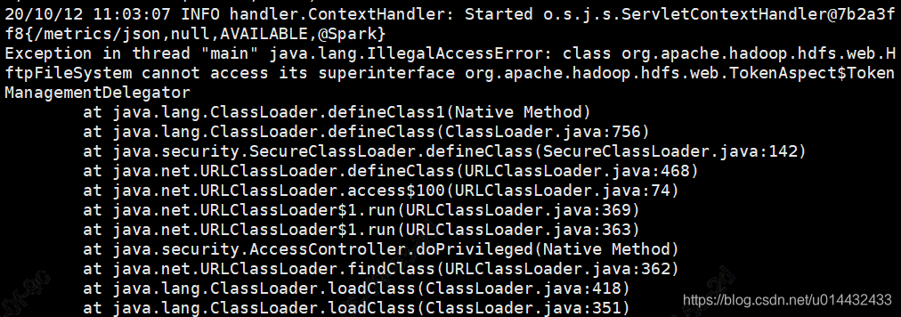 Exception in thread "main" java.lang.IllegalAccessError: class org.apache.hadoop.hdfs.web.HftpFileSystem cannot access its superinterface org.apache.hadoop.hdfs.web.TokenAspect$TokenManagementDelegator