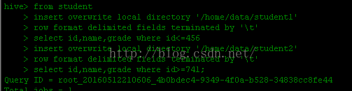 注解:local的有无决定输出文件在本地文件系统还是hdfs;[rowformat delimited fields terminated by '\t']决定文件中数据的格式,且hive版本0.11之后才可以使用。