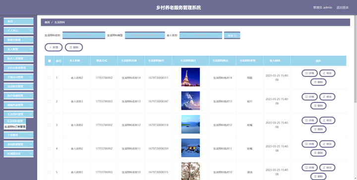 项目管理页面提供的功能操作有:查看生活照料管理,删除生活照料管理操作,新增生活照料管理操作,修改生活照料管理操作。下图就是生活照料管理管理页面。