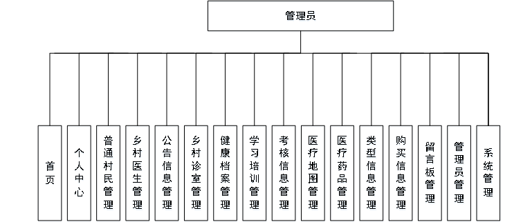 管理员登录进入医疗服务系统可以查看首页、个人中心、普通村民管理、乡村医生管理、公告信息管理、乡村诊室管理、健康档案管理、学习培训管理、考核信息管理、医疗地图管理、医疗药品管理、类型信息管理、购买信息管理、留言板管理、管理员管理、系统管理等内容,如图5-2所示。