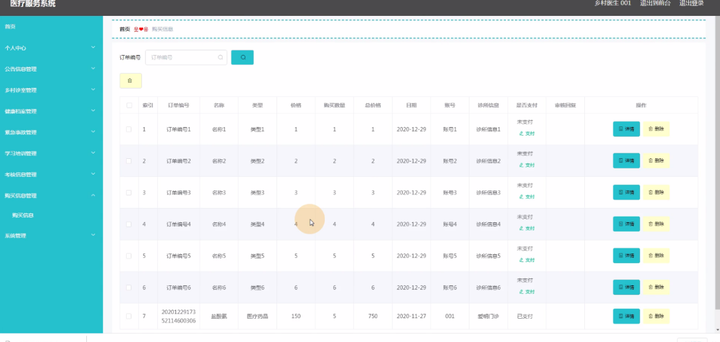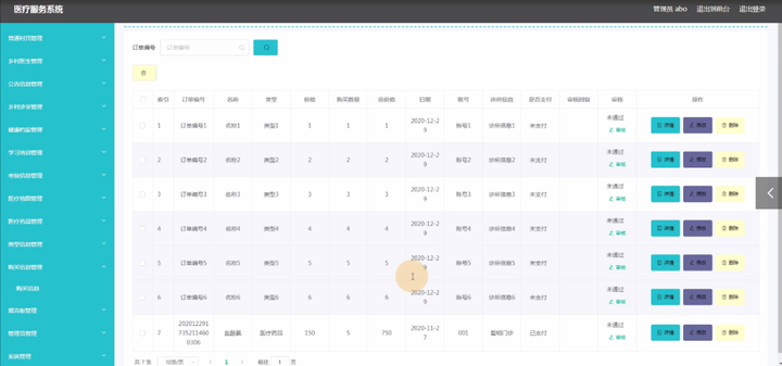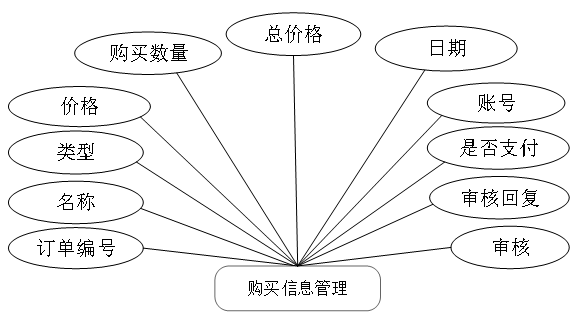 购买信息管理,在购买信息管理页面可以查看订单编号、名称、类型、价格、购买数量、总价格、日期、账号、是否支付、审核回复、审核等内容,并可根据需要对购买信息管理信息进行添加,修改,删除或详细内容等操作,如图5-6所示。