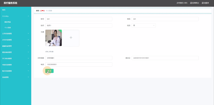 个人信息,在个人信息页面通过填写账号、密码、姓名、性别、头像、诊所信息、身份证、电话等内容并可根据需要对个人信息进行查看、修改,如图5-12所示。