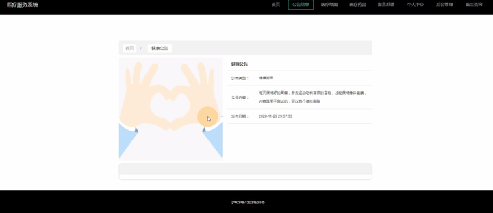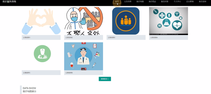 医疗服务系统首页、公告信息、医疗地图、医疗药品、留言反馈、个人中心、后台管理、医生咨询功能。网站首页效果图如图5-23所示:
