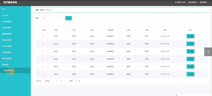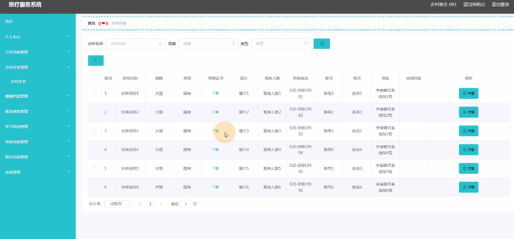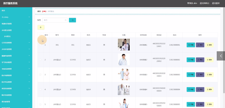 乡村医生管理 ,在乡村医生管理页面可以查看账号、密码、姓名、性别、头像、诊所信息、身份证、电话等内容,并可根据需要对乡村医生管理进行添加,修改,删除或详细内容等操作,如图5-8所示。