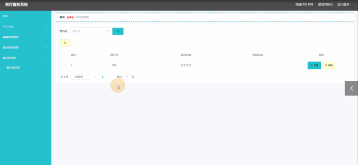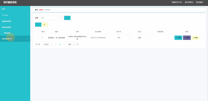 普通村民登录进入医疗服务系统可以查看首页、个人中心、健康档案管理、紧急事故管理、留言板管理等内容,如图5-19所示。