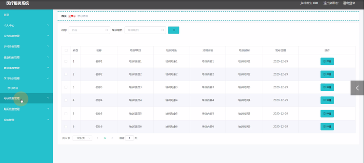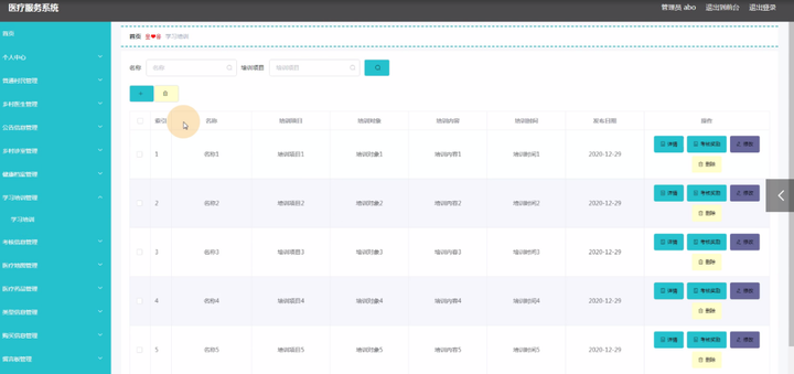学习培训管理,在学习培训管理页面可以查看名称、培训项目、培训对象、培训内容、培训时间、发布日期等内容,并可根据需要对学习培训管理进行详情等操作,如图5-16所示。