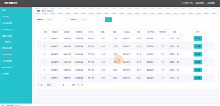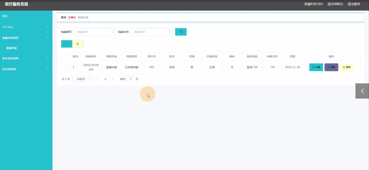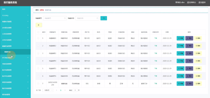 健康档案管理,在健康档案管理页面通过填写档案编号、档案名称、档案类型、用户名、姓名、性别、目前状况、病史、就诊医院、档案文件、日期等内容并可根据需要对健康档案管理进行详情、修改、删除,如图5-20所示。