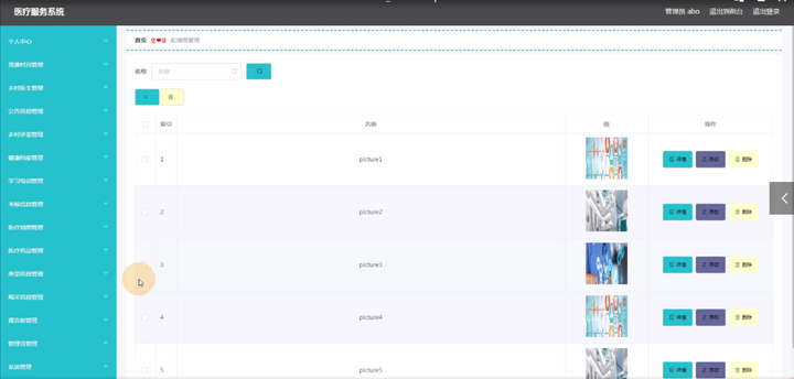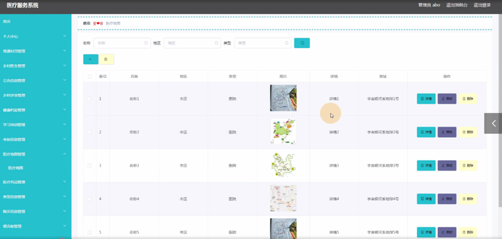 医疗地图管理,在医疗地图管理页面可以查看名称、地区、类型、图片、详情、地址等内容,并可根据需要对医疗地图管理进行添加,修改,删除或详细内容等操作,如图5-9所示。