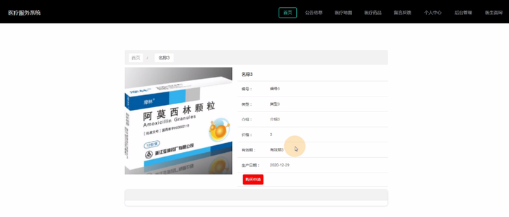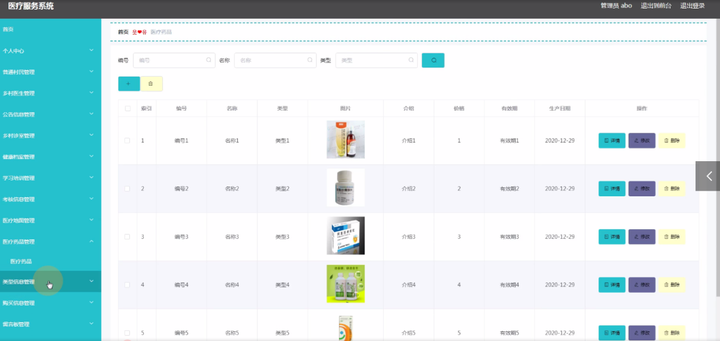 医疗药品管理,在医疗药品管理页面可以查看编号、名称、类型、图片、介绍、价格、有效期、生产日期等内容,并可根据需要对医疗药品管理进行添加,修改,删除或详细内容等操作,如图5-10所示。