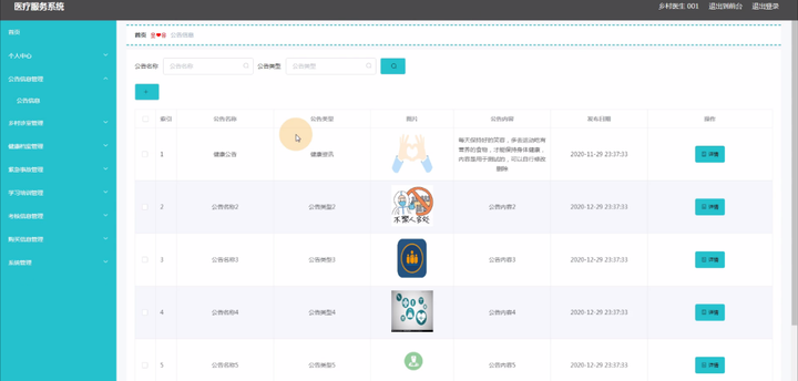 公告信息管理,在公告信息管理页面可以填写公告名称、公告类型、图片、公告内容、发布日期等内容,并可根据需要对公告信息管理详细内容进行详情、修改、删除操作,如图5-13所示。