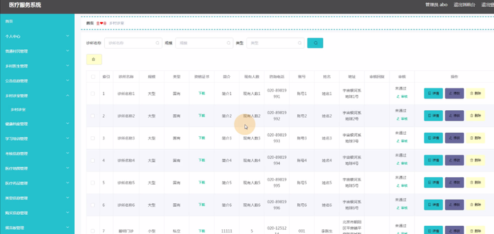乡村诊室管理,在乡村诊室管理页面可以填写诊所名称、规模、类型、资格证书、简介、现有人数、咨询电话、账号、姓名、审核回复等内容,并可根据需要对乡村诊室管理进行添加,修改或删除等操作,如图5-4所示。