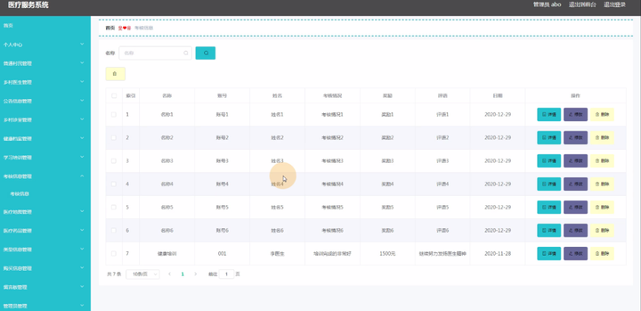 考核信息管理,在考核信息管理页面可以查看名称、账号、姓名、考核情况、奖励、评语、日期等内容,并可根据需要对考核信息管理进行详情、修改、删除等操作,如图5-17所示。