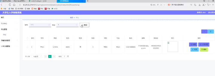 大学生入学审核系统的系统管理员可以对学生信息添加修改删除以及查询操作。具体界面的展示如图5.1所示。
