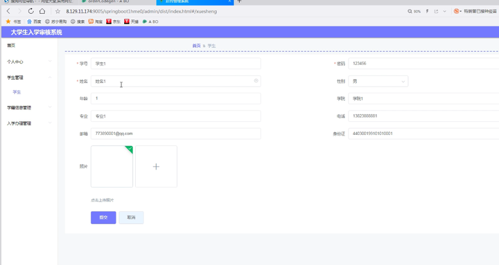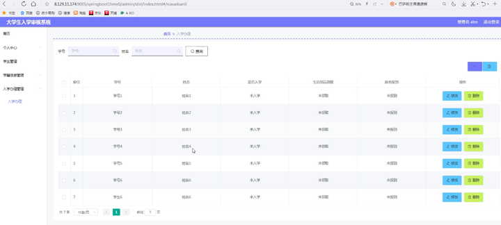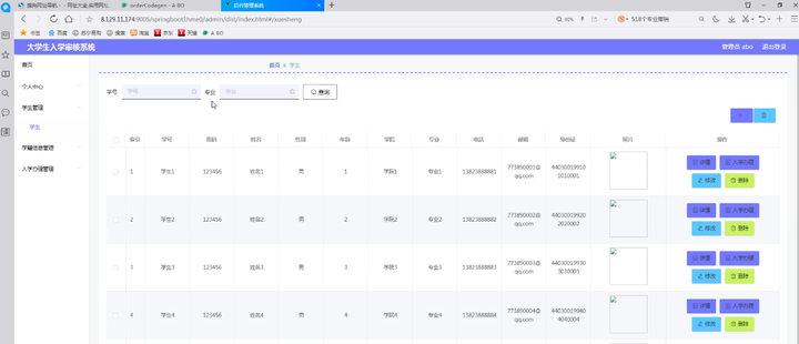 管理员可以对学生入学进行办理,可以添加,修改,删除操作。界面如下图所示: