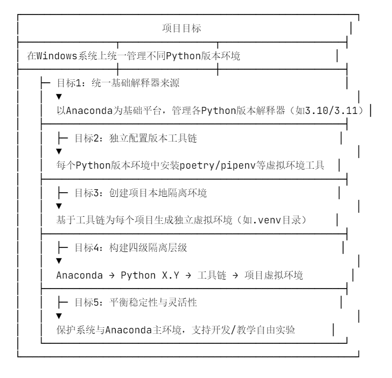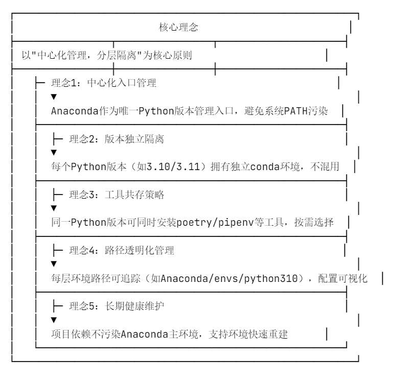 本方案创造性地引入一种 基于 Anaconda 的多级虚拟环境统一管理体系,利用 Anaconda 环境统一管理 Python 各版本,并在其基础上为每个版本分别配置完整的虚拟环境管理工具,实现一套 高度模块化、可控、可追踪、长期维护友好 的结构。我们将详细介绍以下内容: