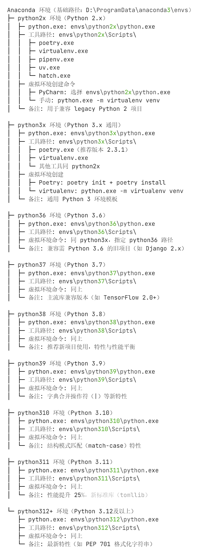 以 Anaconda 为统一 Python 管理平台,结合 Poetry / Pipenv / Hatch / uv / Virtualenv 建立自定义虚拟环境生态,按 Python 版本+工具维度进行“多级隔离”与统一调用。