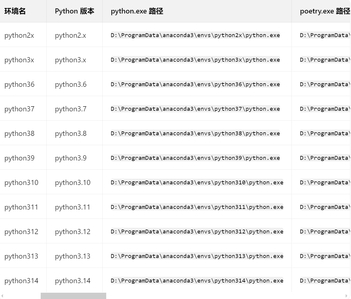 版本明确,结构清晰:每个 Python 版本有独立的环境,不混用。